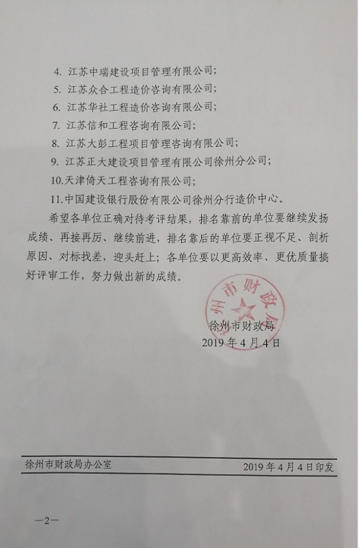 近日,由徐州市財政局組織的協(xié)審單位評比中,我所憑借自身在組織管理、工作進(jìn)度、評審質(zhì)量、道德廉政等方面的優(yōu)異表現(xiàn),榮獲本次評比第一名的好成績。